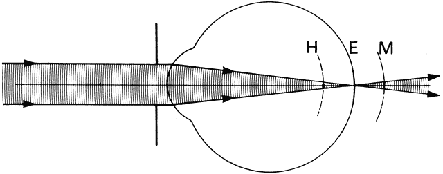 The emmetrope's far-point r is at infinity, therefore, R = 1/∞ = 0. Substitution into the equation R - P = A, results in 10 = 0 - P, or the dioptric value of the near-point is P = -10 D. This corresponds to a near-point distance p = 1/P, or p = -1/10 meter = -10 cm. The emmetrope's range of accommodation is from 10 cm in front of the first principal plane of the eye to infinity. The hyperope has a far-point R = + 5 D, that is, the far-point distance r is 1/5 meter behind the eye. P = R - A = 5 - 10 = -5 D. The near-point distance p is one fifth of a meter in front of the eye. In effect, 5 D of accommodation were exerted to overcome the hyperopia, to see sharply at infinity, and the remaining 5 D determined the near-point. The range of accommodation of the hyperope is from 20 cm in front of the eye, through infinity, to 20 cm behind the eyes (see Fig. 81). The dioptric value of the far-point of the 5-D myope is R = -5. Thus, P = -5 - 10 = -15 D. The range of accommodation of the myope is a = p - r = -100/15 + 100/5 = -6.7 + 20 = + 13.3 cm, or from 6.7 cm to 20 cm in front of the eyes. These examples illustrate the limited range of accommodation available to the myope who otherwise has an amplitude of accommodation equal to that of an emmetrope and hyperope. |