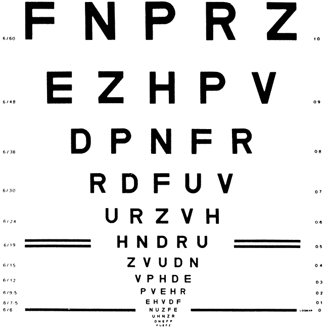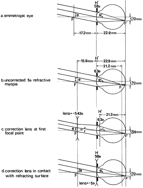 The power of the lens combined with the aphakic eye is 11.75 + 43 = 54.75 D, which corresponds to a focal length of 18.3 mm. The size of the retinal image is the product of focal length multiplied by the angle subtended by the object or 18.3 × 0.1 = 1.83 mm. The RSM = 1.83/1.72 = 1.064 or + 6.4% when the lens is at the cornea, as is a contact lens. If the aphakia is monocular and the other eye is emmetropic, the RSM of 35% and 6.4% also will be equal to the aniseikonia induced by a spectacle and contact lens correction, respectively. |