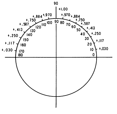 The sine of 0° is 0, the sine of 90° is 1, and the sine of 180° is once again 0. Between 0° and 90°, the values of sine increase from 0 to 1; they show a corresponding decrease between 90° and 180°. The sines of angles from 0° to 180° may be plotted on a graph, as shown in Figure 3 (the round points), and give rise to the sine curve. Many wavelike or cyclic phenomena may be described by a sine curve. In our current example, the changing powers of a cylindric lens seem to follow this curve.