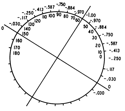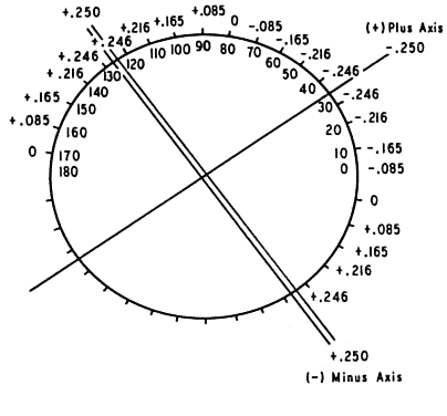 Fig. 8. The 0.25-D cross cylinder. Minus axis is a double line. Power is indicated at each 10° meridian. Axes straddle 170° meridian. (Int Ophthalmol Clin 11:131, 1971)