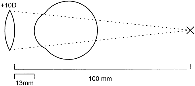 This concept is easier to understand with a couple of examples. We shall consider first a + 10 D and then a -10 D lens, both located 13 mm (vertex distance) from the eye.