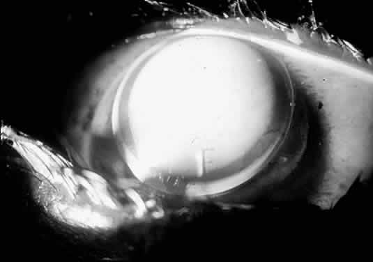 Fig. 9. Contact lens fitted “flatter than K.” Note the “minus” tear lens beneath the contact lens.