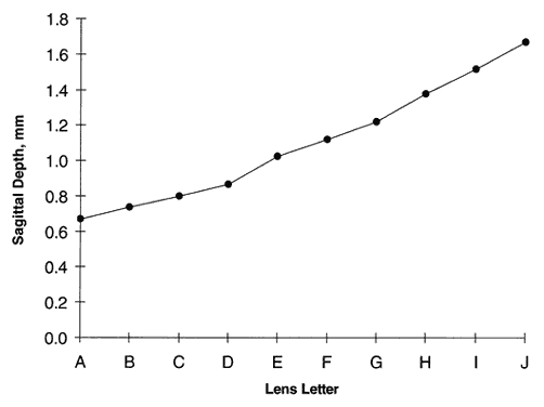 All contact lenses share the same important parameters: diameter, central posterior curve (CPC—also known as base curve, or BC), and power (Fig. 6). Diameter is measured in millimeters, CPC is measured in diopters (for rigid lenses) and millimeters (for SCLs), and power is measured in diopters. Diameter and CPC determine the sagittal depth of a lens (Fig. 7). No one has proven a numerical relationship between sagittal depth and lens fit, but most practitioners believe that an increase in sagittal depth for either a soft or rigid lens results in a more tightly fitting lens.10–13 Thus, the lens itself tightens as the sagittal depth increases. Increasing the diameter of a lens increases the sagittal depth to a great degree and also results in tight fitting.
