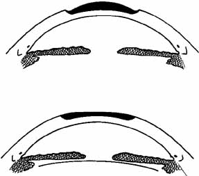 Many other non-Placido disc systems have been used for corneal topography analysis. The most commonly used today (Orbscan, Bausch & Lomb, Rochester, NY) is based on analysis of multiple Scheimpflug slit images of the cornea. Anterior corneal elevation, corneal thickness, and posterior corneal shape can be determined. LAMELLAR REFRACTIVE KERATOPLASTY PROCEDURES Refractive keratoplasty can be divided into lamellar procedures and nonlamellar procedures. Nonlamellar procedures alter corneal curvature without the addition or removal of tissue. Radial keratotomy and various types of incisional surgery for astigmatism are the most common nonlamellar procedures. Lamellar procedures involve the removal of tissue from the cornea or the addition of tissue or synthetic material to change its refractive power. Most lamellar procedures change the refractive power by altering the anterior corneal curvature, which can be accomplished in several ways. A tissue or hydrogel lens can be placed within the corneal stroma (keratophakia and intrastromal hydrogel lens implantation); a tissue lens can be placed on the anterior corneal surface (epikeratophakia); the anterior lamellae of the cornea can be removed, shaped, and replaced (keratomileusis); or the excimer laser can be used to remove corneal stroma, either on the surface or within the stroma. In one lamellar procedure (intrastromal polysulfone lens implantation), a synthetic lens with a high refractive index was placed within the cornea and changed the refractive properties of the cornea without altering the anterior corneal curvature. Each of these procedures is briefly described in the following sections. KERATOPHAKIA AND INTRASTROMAL LENS IMPLANTATION Modern lamellar refractive keratoplasty originated with Jose I. Barraquer's work in Colombia, South America. In 1949, Barraquer developed keratophakia for the correction of aphakia because of the dissatisfaction with aphakic spectacles and the contact lenses and intraocular lenses that were available at that time. His results were first reported in 1963,5 and the procedure was introduced in the United States in 1977.6 Attempts to adapt Barraquer's classic form of keratophakia for the correction of myopia have not been successful. In keratophakia, a plus-powered tissue lens of donor corneal stroma is implanted intrastromally into the patient's cornea (Fig. 3). The portion of the patient's cornea that overlies the implanted tissue lens conforms to the anterior surface of the tissue lens, and the anterior corneal curvature steepens.