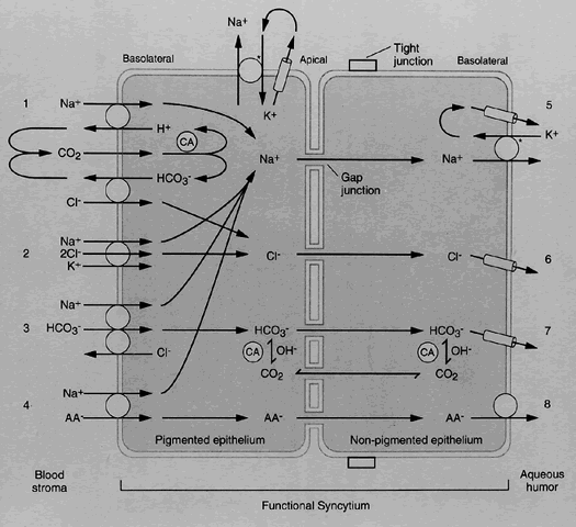 Fig. 3 . Diagram of possible secretory pathways in the ciliary processes. AA, ascorbic acid; CA, carbonic anhydrases. (Adapted from Wiederholt M, Helbig, H, Korbmacher C: Ion transport across the ciliary epithelium: Lessons from cultured cells and proposed role of the carbonic anhydrase. In Botné F, Gross G (eds): Carbonic Anhydrase, p 232. Basel: Verlag-Chemie, 1991)