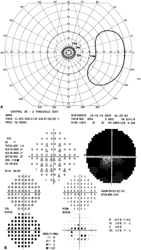 ARCUATE SCOTOMAS. More advanced loss of arcuate nerve fibers leads to a scotoma that starts at or near the blind spot, arches around the point of fixation, and terminates abruptly at the nasal horizontal meridian (Fig. 11). An arcuate scotoma may be relative or absolute. In the temporal portion of the field, it is narrow because all of the nerve fiber bundles converge onto the optic nerve. The scotoma spreads out on the nasal side and may be very wide along the horizontal meridian. Arcuate scotomas may develop closer to fixation in myopes. NASAL STEP DEFECTS. Because of the anatomy of the horizontal raphe, all complete arcuate scotomas end at the nasal horizontal meridian. A steplike defect along the horizontal meridian results from asymmetric loss of nerve fiber bundles in the superior and inferior hemifields. Nasal step defects may be evident in some isopters but not in others, depending on which nerve fiber bundles have been damaged. The width of the nasal step also varies. Nasal steps frequently occur in association with arcuate and paracentral scotomas, but a nasal step also may occur in isolation. Approximately 7% of initial visual field defects are peripheral nasal step defects. TEMPORAL WEDGE-SHAPED DEFECTS. Damage to nerve fibers on the nasal side of the optic disc may result in temporal wedge-shaped defects (Fig. 12). These defects are much less common than defects in the arcuate distribution. Occasionally, they are seen as the sole visual field defect. Temporal wedge defects do not respect the horizontal meridian. |