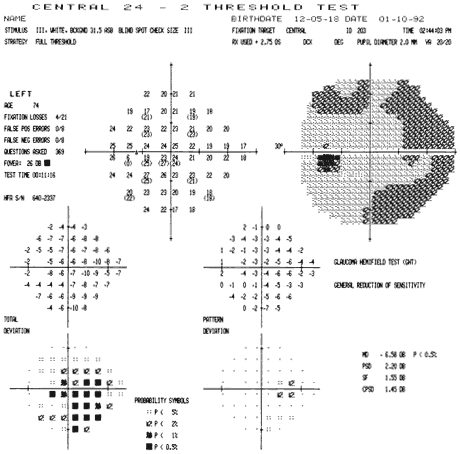 The gray scale is not useful in interpreting SWAP visual fields; SWAPac on the Humphrey is required to correctly interpret the data. Frequency Doubling Technology Frequency doubling technology (FDT) tests the magnocellular pathway. These large diameter fibers make up about 3% to 5% of retinal ganglion cells. Full threshold FDT tests can be completed in less than 6 minutes per eye, and suprathreshold screening can be completed within 1 minute. Results are significantly correlated to testing done using the HFA20 (Figs. 23 to 25). In FDT perimetry, 17 regions are tested within the central 20 degrees of the visual field. Each stimulus is a series of black and white bands that flicker at 25 Hz. A normal eye perceives the illusion of twice the number of bands more closely spaced. Glaucomatous eyes have diminished contrast sensitivity as a result of preferential damage to the My cells and they thus require higher contrast to detect the frequency doubling illusion.24 FDT has been found to have up to 97% sensitivity and specificity for detecting glaucomatous defects.25 EVALUATING THE PATIENT WITH GLAUCOMA Deciding which visual field test to order must be made on a case-by-case basis. The central 24 degrees or 30 degrees automated field test is the most useful test in most glaucoma patients, but it is not necessarily appropriate or ideal for every patient. Central Thresholding Programs Most field testing should concentrate in regions known to be defective. In glaucoma, most defects occur within the central 30 degrees. Defects respect the horizontal meridian, so that routine central programs have test locations positioned on either side of the horizontal meridian rather than on the meridian itself. Commonly used programs for glaucoma are the Humphrey models 24-2 and 30-2. A Humphrey program 30-2 is shown in Figure 19 and a program 24-2 is shown in Figure 17. These programs test the central 24 degrees or 30 degrees with 6 degrees of separation between locations. Humphreyprogram 24-2 eliminates the most peripheral ring of test locations from program 30-2, except in the nasal step region. This is advantageous because the peripheral ring of thresholds provides the least reliable data, and testing time can be shortened. Full threshold or SITA standard strategies can be used with either the Humphrey 24-2 or 30-2 programs. Thresholding programs are essential for accurately detecting glaucomatous visual field defects and following patients for progressive damage. Thresholding programs can detect early diffuse depressions of the visual field. Thresholding programs can detect changes in scotoma depth, which is the most common mode of progression. Thresholding programs also permit calculation of the short-term fluctuation, which facilitates the interpretation of field defects. Full threshold or SITA standard canbe used. SITA standard has virtually replaced Fast-pac because it provides more reliable data in a shorter time. Central 10 Degrees A program such as the Humphrey 10-2 that uses tightly spaced locations in the central 10 degrees is preferable to a 24- or 30-degree program in two situations. If a localized defect is detected within 10 degrees of fixation on a standard central test, a 10-degree program can help determine how close to fixation the defect extends (Fig. 26). If the patient has advanced defects, a small central island can be tested with a 10-degree program; the higher resolution provides more data points for follow-up and patient anxiety can be reduced by limiting testing to seeing areas.