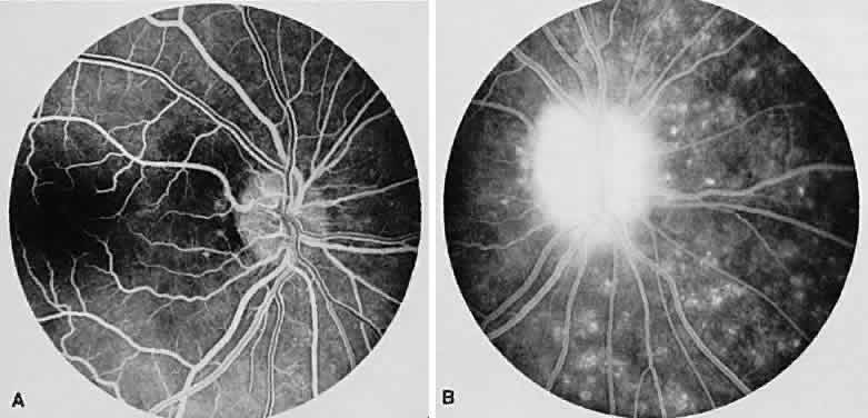 The FA reflects the various clinical entities. Retinal venular walls stain, particularly where there are perivenular exudates.25–27 More extensive venous involvement can produce a picture of dilated veins and perivenous leakage.27 Peripheral neovascularization occurs near areas of retinal capillary nonperfusion.25,28 Optic disc granulomas and optic disc neovascularization both leak extensively (Fig. 8A); sarcoid retinal lesions also stain (see Fig. 7B).27 In disc edema, the disc is hyperfluorescent and leaks fluorescein (see Fig. 8B).25