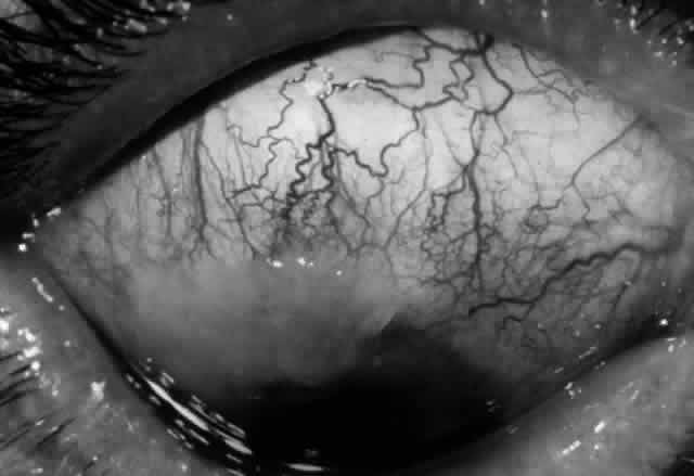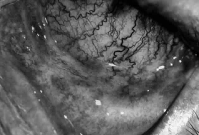 Ocular Manifestations Clinically, the ocular disease in cicatricial pemphigoid (OCP) may present unilaterally in the form of a chronic, recurrent catarrhal conjunctivitis, but it eventually becomes bilateral. Subepithelial fibrosis is characteristic of stage 1 of OCP (Fig. 7). Stage 2 shows fornix foreshortening (Fig. 8), and symblepharon formation is the hallmark of stage 3 (Fig. 9). Stage 4, end-stage disease, is characterized by ankyloblepharon and surface keratinization (Fig. 10). Obstruction of the lacrimal ductules and meibomian gland ducts eventually produces an unstable tear film and progressive sicca syndrome, but it is to be emphasized that OCP is not a dry-eye syndrome until late in the disease course.20 Trichiasis and entropion occur because of the subepithelial fibrosis, with eventual keratopathy, corneal neovascularization, and corneal ulceration and scarring.20
