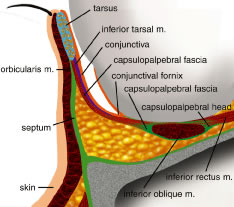 From the arcus marginalis, the septum spans the anterior orbit in a plane deep to the orbicularis oculi muscle and ultimately fuses with the eyelid retractors or tarsus (Fig. 11). In the upper eyelid, the orbital septum adjoins the posterior epimysium of the orbicularis before it fuses with the levator aponeurosis approximately 2 to 3 mm above the superior tarsal border and about 10 mm above the lash line.16 In the lower eyelid, the septum arises from the inferior orbital rim as a condensation of the periorbita and periosteum. It continues anteriorly until it joins with the lower eyelid retractors as a single unit at a point 4 to 5 mm below the inferior tarsus or it inserts on the lower border of the tarsus. The septum travels medially with the pretarsal orbicularis muscle and attaches to the posterior lacrimal crest with a few fibers extending to the anterior lacrimal crest. Laterally, the septum attaches to the deep insertion of the pretarsal segment of the orbicularis muscle and inserts onto the lateral orbital tubercle.17