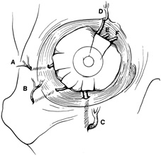 The lateral rim may be left in place and dissection carried out anterior to its posterior recess at the lateral canthus (see Fig. 29B). Because the lateral rim recesses posteriorly at the canthus, the posterior surface of the globe and anterior retrobulbar space usually are accessible. If exposure is limited, the lateral rim can be partially thinned with a bone burr until there is ready access to the retrobulbar space. Sharp dissection through the intermuscular septum allows entry into the retrobulbar intraconal space (see Fig. 29C). Closure is accomplished by simply reapproximating the superior and inferior crura of the lateral canthal tendon and closing the canthotomy skin incision. INDICATIONS Anterior peripheral and intraconal lesions and the lateral retrobulbar optic nerve can be readily approached with this technique. There is no need for disinsertion of the lateral rectus muscle because its belly can be retracted out of the field. |