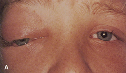 After the periorbita has been elevated internally, and the periosteum reflected laterally and superiorly to completely expose the lateral rim, a large malleable retractor is placed between the orbital contents and the mesial surface of the lateral orbital rim. This protects the orbital contents while an air-driven saw is used to make two osteotomies. One is placed superiorly about 0.5 cm above the zygomaticofrontal suture. Aligning the saw blade toward the upper molars on the opposite side (an angle of 45°) produces a wide opening while avoiding inadvertent entry into the overlying frontal cranial fossa by the saw blade. Finger palpation of the orbital roof beneath the brow reminds the surgeon of the location of the frontal lobe and helps ensure that the saw is not angled in a fashion to allow intracranial penetration. A second osteotomy is made inferiorly through the lateral rim just adjacent to the floor of the orbit above the zygomatic arch. The osteotomies may be shifted superiorly or inferiorly depending on the exact location of the orbital lesion, but an opening in the lateral wall of 2.5 to 3 cm is desirable. After the saw cuts have been made, a wire-passing drill bit is used to preplace drill holes above and below each of the two osteotomies so that the bone can be refixated at the completion of the procedure. Care is taken again to angle the superior drill hole to avoid intracranial penetration and to protect orbital contents with a wide malleable retractor. The lateral rim is out-fractured with large rongeur by gently “rocking” the rim outward, and remaining strands of temporalis muscle at the posterior edge of the bone fragment may be cut with the unipolar cautery. The rim is removed and placed off the field in moist gauze. Great care is taken to avoid inadvertent contamination of the lateral rim as it will be replaced at the end of the procedure. After out-fracture of the lateral rim, the thinner bone behind the rim can be removed with a rongeur to provide better access to the orbital apex. Bone removal usually is carried posteriorly to the pterion, the thicker wedge of cancellous bone that constitutes the body of the greater wing of the sphenoid. Hemorrhage from the cancellous bone may be brisk and may require tamponade with bone wax for control. The temporalis fascia is retracted posteriorly with broad malleable retractors so that the apical periorbita can be exposed. Relaxing incisions can be made with the unipolar cautery through the superior temporalis muscle if it is difficult to adequately expose the apex. The lateral rectus muscle and lacrimal gland lie just beneath the periorbita along the lateral orbit (see Fig. 6F), and damage to these structures is avoided by opening the periorbita with blunt-tipped scissors. A traction suture placed transconjunctivally beneath the insertion of the muscle can be manipulated to help identify the belly of the lateral rectus posteriorly in the orbit. A longitudinal periorbital incision beginning anteriorly and extending back to the orbital apex will allow extensive retraction of the periorbita. Additional vertical relaxing incisions through the periorbita may be made anteriorly. The periorbita is retracted, and the lateral rectus muscle and lacrimal gland are identified. If the lesion lies in the intraconal space, sharp dissection to release the intermuscular septum, either above or below the lateral rectus muscle, is usually required to gain access to the retrobulbar space. Sewall orbital retractors provide retraction of the lacrimal gland and lateral rectus muscle. Depending on the location of the lesion superiorly or inferiorly within the orbit, dissection is carried out above the superior border or below the inferior border of the retracted lateral rectus muscle. Deep orbital dissection requires fiberoptic illumination and loupe magnification at a minimum, and often it is best performed with the operating microscope to aid in identification of the vital vascular and neural structures within the orbit. After removal or biopsy of the proposed lesion, the orbital rim is reinserted and fixated with sutures passed through the predrilled holes, or with rigid screw and microplate fixation (see Fig. 6H). Usually it is not necessary or desirable to close the periorbita because this allows for decompression of any postoperative retro-orbital hemorrhage into the temporal fossa. After the bone has been resutured in place, the anterior cut edges of periorbita and periosteum along the lateral rim may be loosely reapposed over it to prevent the overlying orbicularis-skin flap from adhering to the bare bony rim. The eyelid crease incision can be closed with a running suture (see Fig. 6I) as one would after upper blepharoplasty. A drain may be placed in the temporal fossa and brought through the lateral aspect of the incision or through a separate stab wound and connected to external suction for the first 24 hours postoperatively if there is any question about complete hemostasis. Indications Lateral orbitotomy provides excellent access to deep lesions in the subperiosteal, peripheral, or intraconal space lateral to the optic nerve (Fig. 8A, B).