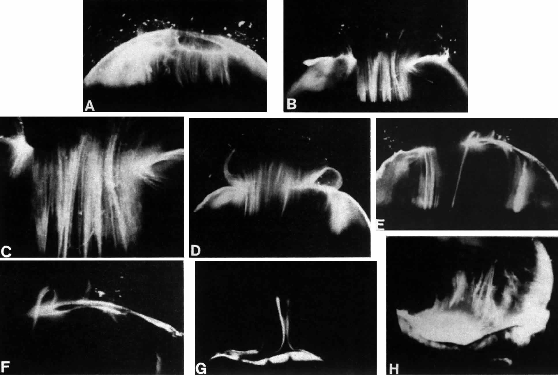 Fig. 4. Human vitreous structure is visualized by darkfield slit microscopy. All photographs are oriented with the anterior segment below and the posterior pole above. Photographs are sequential, beginning in the upper left hand corner and moving left to right. A. Posterior vitreous in the left eye of a 52-year-old man. The corpus vitreous is enclosed by the vitreous cortex. There is a hole in the prepapillary (small, to the left) vitreous cortex. B. Posterior vitreous in a 57-year-old man. A large bundle of prominent fibers is seen coursing anteroposteriorly and entering the retrohyaloid space through the premacular vitreous cortex. C. Same view as B at higher magnification. D. Posterior vitreous in the right eye of a 53-year-old woman. There is posterior extrusion of vitreous out the prepapillary hole (to the right) and premacular (large extrusion to the left) vitreous cortex. Fibers course anteroposteriorly in the central vitreous and out into the retrocortical (formerly preretinal, before dissection) space. E. Horizontal optical section of the same specimen as D at a different level. A large fiber courses posteriorly from the central vitreous and inserts into the premacular vitreous cortex. F. Same view as E at higher magnification. The large fiber has a curvilinear appearance because of traction by vitreous extruding into the retrocortical space. However, because of its attachment to the posterior vitreous cortex the fiber arcs back to its point of insertion. G. Anterior and central vitreous in a 33-year-old woman. Cloquet's canal is seen forming the retrolental space of Berger. H. Anterior and peripheral vitreous in a 57-year-old man. The specimen is tilted forward to enable visualization of the posterior aspect of the lens and the peripheral anterior vitreous. Behind and to the right of the lens there are fibers coursing anteroposteriorly that insert into the vitreous base. These fibers “splay out” to insert anterior and posterior to the ora serrata. (A, E, and F: Sebag J, Balazs EA: Pathogenesis of cystoid macular edema: An anatomic consideration of vitreoretinal adhesions. Surv Ophthalmol 28[suppl]:493, 1984; B and C: Sebag J, Balazs EA: Morphology and ultrastructure of human vitreous fibers. Invest Ophthalmol Vis Sci 30:187, 1989)