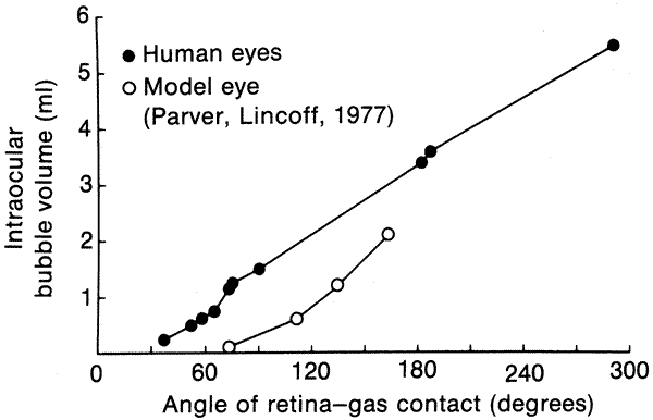 HISTORY The first use of intraocular air recorded in literature was in 1911 by Ohm. He and several subsequent investigators were unaware of the relationship of retinal holes and retinal detachments, but they were still able to reattach an occasional retina. Subsequent to Gonin's discovery that retinal holes were the cause of retinal detachment, Rosengren used intravitreal air injection with drainage of subretinal fluid and diathermy. He achieved a 77% reattachment rate, which was a tremendous advance at that time. In the 1950s, the use of air became less popular because of rapid advances in the scleral buckling technique. Intravitreal air was used for supplementation of buckling procedures throughout that period. In 1973, Norton used sulfur hexafluoride (SF6) gas for a longer tamponade than was provided by air injection for difficult retinal detachments, particularly giant tears.83 Vygantas and colleagues59 were the first to use perfluorocarbon gases to provide a longer intraocular tamponade than SF6. Lincoff and associates then developed several perfluorocarbon gases.65,72 Air, SF6, and perfluoropropane were used for many new vitrectomy procedures throughout the 1970s and 1980s. In 1984, Hilton reported a series of pneumatic retinopexy patients in which he advocated the use of intraocular gas tamponade as a primary treatment for selected retinal detachments.64 MODE OF ACTION AND PHYSICAL PROPERTIES Surface tension between gas bubbles and surrounding fluids is the most important physical property of the gases in retinal reattachment. The gas bubble is positioned so that it occludes the retinal break either continuously or a substantial percentage of the time to prevent bulk flow of fluid through the hole. This allows the natural reabsorption of subretinal fluid to slowly reattach the retina. Surface tension arises from electrostatic attractive forces between fluid molecules. These van der Waals forces are both weaker and longer range than the electronic exchange forces of the chemical bond. Van der Waals forces are responsible for condensation of vapors into liquids. The most important attractive force is the dispersion or London-van der Waals force, which arises from neutral atoms because they are oscillating systems of negative electronic charges around a positive nuclear charge.60 Hydrogen bonding and dipolar interactions also can play a role in surface tension. Dipolar forces arise from uneven charge distribution around a molecule. Internal molecular attraction forces neutralize each other in the bulk of the fluid but are not neutralized at the surface. The surface tension arises from lateral extension of the surface caused by crowding of interior molecules being brought to the surface by the attractive forces that are not neutralized. The attractive intermolecular forces decrease as the seventh power of the intermolecular distance. Thus, the surface tension layer is only one to two molecules thick. The saline–gas interface produces the highest surface tension available to the ophthalmologist (measuring approximately 60 ergs/cm2), because the attractive forces in the saline are not neutralized by the overlying air at the air–fluid interface. Another important property of gas is buoyancy, which is a result of the large difference in specific gravity between fluid and gas. A fresh, freely movable superior tear tamponaded with a large air bubble will usually displace fluid inferiorly and away from the tear, allowing it to flatten against the wall of the eye. Buoyancy directs the effectiveness of the tamponade, which for gases on earth must always be in the gravitational upward direction. Large bubbles and face-down positioning are required to tamponade inferior retinal breaks. The solubility of a gas in the aqueous medium is the most important property determining the reabsorption rate of a gas bubble from the vitreous cavity.61 If the gas bubble is less soluble than nitrogen, expansion of the bubble can occur. Expansion can also occur with relatively soluble gases such as air when the patient is breathing nitrous oxide, which is more soluble than air in water. The relationship between bubble volume and its arc of contact inside the eye is important. It determines how much gas is necessary to treat a tear or group of tears of a specific size and proximity. By using a glass model eye, it was determined that in an average eye with a diameter of 21 mm, approximately 0.28 ml of gas is required to give a 90-degree arc of contact.62,63 In a larger myopic eye of 24-mm diameter, 0.42 mL would be required. The respective volumes for an arc of contact of 120 degrees are 0.75 mL for the normal eye and 1.13 mL for the myopic eye. An arc of contact of 180 degrees requires respective bubble sizes of 2.4 mL and 3.62 mL. A later study using computed tomography of actual human eyes showed that for an arc of contact of 90 degrees, a somewhat greater volume of approximately 1.5 mL was required (Fig. 3).64 BIOCOMPATIBILITY SF6 and the perfluorocarbon gases have a purity of 99.8% or better. Although they are frequently injected as mixtures with air, the pure gases are usually described as chemically nonreactive, colorless, odorless, and nontoxic. Earlier papers show haziness of the vitreous after SF6, perfluorocarbon, and air injection.65 Pathologic examination of the retina showed some changes in the outer layer of the retina, but these changes were no worse in eyes injected with long-acting gas than in the eyes injected with air.66 A study using SF6 and perfluoropropane monitored by the FDA under an investigational device exemption for pneumatic retinopexy showed no significant flare or cell with the biomicroscope.67 No significant vitreous inflammation measured by the National Eye Institute scale was noted for either SF6 or perfluoropropane. SF6 may contain up to 0.3 ppm of hydrogen fluoride. This is generally regarded as the most toxic contaminant found in SF6. There is an established threshold limi