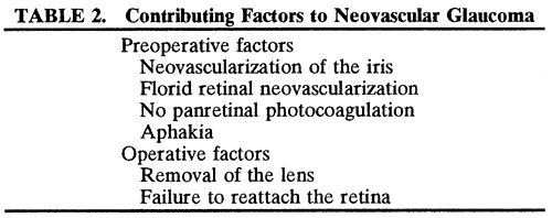 About half of the cases of NVG occur in eyes that are surgical failures because of inoperable retinal detachment. It is not known why retinal detachment predisposes to NVI. One theory is that the detached retina is relatively hypoxic because it receives less oxygen from the choroid and therefore produces more vasoproliferative factors. Another theory is that the hypoxic-detached retina contributes to a high oxygen gradient from the anterior segment to the vitreous, drawing more oxygen away from the iris. There are several possible mechanisms for the increased incidence of NVI after vitrectomy. First, the formed vitreous may inhibit anterior diffusion of vasoproliferative factors produced by hypoxic retina, which, after vitrectomy, may diffuse into the anterior chamber and onto the iris, especially if the eye is aphakic. Second, the vitreous itself may inhibit a vasoproliferative factor. Third, vitrectomy, especially if combined with lensectomy, permits anterior chamber oxygen to diffuse posteriorly into the vitreous (the so-called oxygen steal). Stefansson and colleagues317a found that the oxygen tension in the cat inner retina was 20 mmHg, whereas that in the anterior chamber was 34 mmHg. After lensectomy and vitrectomy, the anterior chamber tension fell to 22 mmHg.139 Because NVG and NVI are more common in aphakic eyes of diabetic patients than in phakic eyes, a brief discussion of lensectomy during vitrectomy is necessary. Removing the lens has three major advantages. First, it provides the best possible view of the posterior pole, making posterior dissections safer. Second, it facilitates air-fluid exchange. Third, it allows residual and recurrent hemorrhages to clear faster, improving postoperative visual acuity. Balanced against the advantages of lensectomy are two minor disadvantages and one major one. The minor disadvantages are that it increases the likelihood of erythroclastic glaucoma and that it decreases postoperative visual function unless a contact lens can be worn successfully. The major disadvantage is the one that, by far, overshadows the advantages: nearly all studies have indicated that lensectomy increases the incidence of NVG. Blankenship318 did the only prospective study of this problem when he randomly assigned 50 eyes with clear lenses to either lensectomy or nonlensectomy. In eyes that did not have preoperative NVI, NVG developed in 35% of the lensectomy group patients and in 13% of the nonlensectomy group patients. If rubeosis iridis is present before vitrectomy, the eye should be treated with panretinal photocoagulation or panretinal cryotherapy a few weeks before elective vitrectomy. Even if the rubeosis does not regress, vitrectomy is not contraindicated because the rubeosis may not progress to NVG. When rubeosis iridis is detected on a postoperative examination, prompt treatment with panretinal photocoagulation may prevent progression to NVG. As cited in the series by Tolentino and coworkers,313 with such aggressive treatment, only seven of 174 patients operated on for diabetic traction retinal detachment had NVG develop. If the above measures fail, cyclophotocoagulation or a glaucoma tube shunt may maintain normal IOP and preserve vision. Fortunately, if an eye does not develop rubeosis iridis in the first 4 to 6 months after vitrectomy, it rarely does so later. Neovascularization also may originate from the anterior retina and extend along the anterior hyaloid to the posterior lens surface (anterior hyaloidal fibrovascular proliferation).319 The highest risk of this complication is in eyes with severe retinal ischemia and florid retinal neovascularization. Anterior hyaloidal fibrovascular proliferation may be the source of postoperative vitreous hemorrhage. In severe cases, it can cause detachment of the peripheral retina or ciliary body with hypotony. In vitrectomy for vitreous hemorrhage, the surgeon must carefully aspirate as much erythrocyte debris as possible because erythrocyte ghost cells (erythroclasts), unlike living erythrocytes, are too inflexible to pass through the trabecular meshwork.320 They can block enough aqueous outflow to cause increased IOP. Because many diabetic patients who require vitrectomy have poor retinal arterial perfusion, this dangerous complication may cause arterial occlusions. Occasionally, the erythro-clasts must be irrigated from the anterior chamber to decrease the IOP. The incidence of postoperative pressure abnormalities with vitreous substitutes is variable. In the Silicone Study, 8% of eyes with SO had IOPs above 25 mmHg on two consecutive visits.142 However, in Honovar's recent report, 40% of eyes with SO had glaucoma after surgery. This difference may be because Honovar included patients not only with PVR but also with trauma, diabetes mellitus, vasculitis, and giant retinal tears. Nevertheless, eyes with SO need to be followed closely for glaucoma. There are several possibilities for pressure elevation in eyes with SO. SO droplets may cause mechanical obstruction of the trabecular meshwork.321 SO also may cause pupillary block, which can be avoided with an inferior iridectomy.322 An SO overfill may result in angle-closure glaucoma. IOP elevations with inert gases tend to be acute. Only 2% of patients given inert gas in the Silicone Study had chronically elevated pressure.142 However, 26% to 59% of eyes with gas have elevated IOP in the immediate postoperative period.323 This usually can be treated medically, but sometimes a small volume of gas needs to be removed. Patients should not fly on planes with an intraocular gas bubble because of gas expansion at high altitudes. In addition, nitrous oxide should be turned off 15 minutes before intraocular gas is placed. The nitrous oxide can diffuse into the gas bubble rapidly, causing it to expand. Significant acute elevation of the IOP can occur after vitrectomy without vitreous substitutes or scleral buckling. The greatest elevation occurs 2 hours after surgery and t