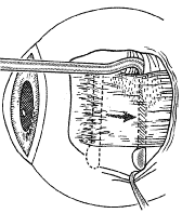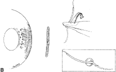 A Castroviejo caliper is used to mark a point on the sclera at a predetermined distance from the posterior portion of the muscle insertion (Fig. 31). Some surgeons prefer to mark the sclera the using the limbus as a reference point. These surgeons believe that it is more accurate to measure from the limbus than from the insertion of the rectus muscle because the insertion may have some anatomic variation. If a large recession procedure will be performed, measurement from the limbus will introduce a cord effect that will increase the amount of recession achieved (Fig. 32). To reduce this effect, William Scott has designed a curved ruler that provides a more accurate measurement of the arc. It is important for the surgeon to be careful and consistent with the measurement technique so that the effect of the surgical procedures can be critically evaluated. The needle is grasped with a locking Barraquer needle holder at the middle portion of the shaft. Grasping the S wedged portion of the needle can cause the needle to roll within the jaws of the needle holder and this can increase the risk of penetration of the sclera. At the mark created by the caliper, there is usually a small dimple or depression in the sclera. The mark results from expressing water from the sclera so that the blue color of the uvea is seen. Because the muscle will attach to the globe at the point at which the needle tip enters the sclera, care is taken to start the intrascleral needle pass at the point marked by the caliper (Fig. 33). Care should be taken not to introduce any unintentional supraplacement or infraplacement effect of the tendon at the new insertion. The width of the insertion should be preserved: The width of the new insertion should equal the width of the original insertion. If the width of the insertion is not preserved, the muscle will not pull up to the new insertion evenly (Fig. 34A and B). If there is a sag in the new insertion caused by the new insertion site being too narrow, the suture can be passed back through the insertion to pull the center of the sagging muscle tendon back to the insertion (Fig. 35). The fine wire needles need to be passed following the curvature of the needle tip. Attempts to elevate the tip of the needle while it is in the sclera can cause the needle shaft to bend (Fig. 36A and B). Some surgeons advocate a “crossed-swords technique” so that the second needle pass does not cut the suture from the first needle pass. With appropriate magnification, the other end of the suture is easily avoided. Once the needles have been passed through the sclera, the muscle is pulled up to its new insertion (Fig. 37). A Stevens' hook is used to keep the Tenon's and other surrounding tissue from being drawn into the insertion. The synthetic absorbable sutures tend to drag Tenon's tissue when the suture comes in contact with this tissue. Coating the suture tends to minimize this problem but does not completely eliminate it. The muscle is tied with a surgeon's (double throw) knot that is further secured with two or three square knots. The new insertion is checked and measured to verify that the muscle is in the desired position. After the measurement is checked, the locking Castroviejo forceps are removed. The conjunctival edges of the wound are repositioned or swept closed with a muscle hook. The wound is not sutured. After the procedure, we do not use ointments or occlusive dressings. A drop of an antibiotic-steroid solution can be applied at the discretion of the surgeon. RESECTION PROCEDURE: FORNIX INCISION This procedure is a resection of a lateral rectus muscle. The approach to the rectus muscle to be resected is similar to that of the recession. The limbus is grasped with a Lester forceps. The globe is rotated up and away from the muscle to be resected. The conjunctiva is incised, and the rectus muscle is grasped with a Stevens' hook that is replaced with a Jameson hook. The Tenon's tissue and intermuscular septa are cut and reflected onto the Jameson hook. The intermuscular septa are cut with a Westcott scissors. The rectus muscle tendon is then suspended between the Jameson muscle hook (Fig. 38).