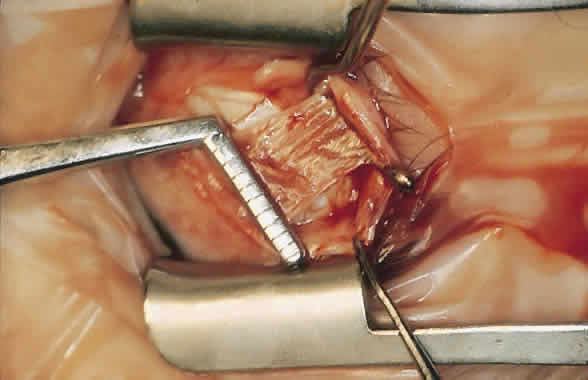 After the sutures have been placed, the muscle is disinserted from the globe with Westcott scissors. The cut is made as nearly flush to the globe as possible, and a minimal stump from the original insertion is visible under the replaced conjunctiva postoperatively. The advantage of this technique is that the suture that passes through the muscle between the lock bites at each edge maintains the normal width of the muscle when the muscle is removed from the insertion and resutured to the globe (Fig. 4). Placing the suture more than 1 mm from the insertion results in a resection as well as a recession and decreases the expected effect of the recession. The caliper is set at a predetermined amount to mark the site of the new insertion. The sclera is marked for needle placement directly posterior to one pole of the original insertion. The mark and the start of the subsequent needle pass must be made perpendicular to the end of the insertion to eliminate unintentional supraplacement or infraplacement. The second mark is made perpendicular to the other end of the original insertion (Fig. 5). The needles are passed so that their tips cross (Fig. 6). This placement allows the knot to be tied on a spot rather than around the curve of the globe. Tying a knot around the curve of the globe is similar to tying a string around a ball. After the muscle is pulled up and the knot is tied, each end as well as the middle of the muscle is measured with the caliper from the original insertion (Figs. 7 and 8). If the middle of the recessed muscle is sagging more than 0.5 mm, then one end of the suture is brought up through the middle of the muscle. The needle is passed just behind the area where the preplaced suture passes through the muscle. The middle of the muscle is then pulled up when the suture that is placed through the middle of the muscle is tied to the other end of the suture. It is important to measure from the same place on the muscle insertion, either the anterior, middle, or posterior part. I find it easiest to measure from the posterior edge because it is usually the most distinct landmark after muscle disinsertion. The accuracy of recessions should be within 0.5 mm. When a resection is performed, the medial rectus muscle is isolated. The muscle is cleaned of anterior Tenon's tissue and intermuscular septum back for 3 to 4 mm more than the amount of planned resection to allow for suture placement in the muscle. During a resection, a Jameson muscle clamp is placed around the muscle (tendon) as close to the insertion as possible (Fig. 9). With a caliper, the amount of muscle to be resected is measured back from the insertion on the belly of the muscle (Fig. 10). The double-armed 6-0 Polyglactin 910 suture is placed in the muscle at this point, following the procedure that is used for a recession. One end of the suture is locked at each margin of the muscle (Figs. 11, 12, and 13). The muscle is then disinserted. The preplaced sutures are positioned in the original scleral insertion. One is started at each end of the insertion, and both exit in the middle (Figs. 14 and 15). The sutures are passed up through the muscle belly, just behind the preplaced suture (Fig. 16). The Jameson clamp is used to position the muscle across the insertion at the level of the preplaced sutures, and the sutures are tied (Fig. 17). The muscle distal to the suture is then exercised (Fig. 18).
