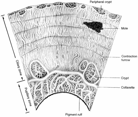 The iris is the anterior extension of the uvea that forms a mobile diaphragm between the posterior chamber and anterior chamber of the eye (Fig. 8).1,2 The central aperture of the iris forms the pupil, through which light enters the eye. The diameter of the pupil, which varies from 1.5 to 8 mm, is regulated by movement of the iris, thus impacting the amount of light that enters the eye. The iris extends transversely in a radial direction from the center of the eye to approximately 1 mm posterior to the corneoscleral junction where it joins the ciliary body.41 The anterior surface of the iris is visible through the cornea and is separated from the cornea by the anterior chamber of the eye. Its posterior surface faces the posterior chamber, and its central portion is in contact with the anterior surface of the lens. The diameter of the iris is approximately 12 mm. The cornea magnifies the image of the iris by approximately 10%. The shape of the iris resembles the cut base of a cone, with the apical opening defining the pupillary border surrounding the pupillary aperture (Fig. 9) and the basal aperture defining the peripheral or ciliary border. Thus, in accordance with the convexity of the underlying lens, the pupillary plane of the iris is anterior to its periphery. When compared to the center of the cornea, the center of the pupil is slightly displaced inferiorly and nasally. The collarette of the iris is a wavy circular line approximately 1 to 1.5 mm from the pupillary border, between the inner one-third and outer two-thirds on the anterior surface of the iris. It marks the zone that separates two concentric rings of the iris: the inner pupillary zone (1–2 mm in width), which contains the sphincter muscle, and the outer ciliary zone (3–4 mm in width). The collarette is the thickest portion of the iris, measuring 0.6 to 1.0 mm; the iris becomes thinner toward the pupil and even thinner in the periphery (0.3–0.5 mm), where it joins the ciliary body.41 The anterior surface of the iris (Fig. 10) is also characterized by small connecting crests in the pupillary zone, deep radial slits known as Fuchs crypts or stomates at the collarette, and deep round ruts, which are mostly incomplete and concentric to the pupillary border in the ciliary zone. The radial ridges are the result of the radially oriented blood vessels and the connective tissue surrounding them in the iris stroma. There is an incomplete circle of arteries (minor circle of the iris) at the collarette. The blood supply to the iris is from the long posterior ciliary arteries that form the major arterial circle of the ciliary body located just peripheral to the iris root.42,43 The anterior surface of a darkly pigmented iris is dense and thickly matted with few visible fibrils, compared with a blue or less darkly pigmented iris. The posterior surface of the iris is black or dark brown, except in albino subjects, and is also characterized by various types of folds or plicae. Schwalbe's contraction plicae are radial folds in the pupillary region. Schwalbe's structural plicae are wider than the contraction plicae and are located in the ciliary zone. Circular plicae are fine circular folds present near the papillary margin caused by variations in epithelial thickness. The iris consists of five layers. The anterior border layer consists of densely packed melanocytes and fibroblasts with little collagen. This layer is thickest at the collarette and thin or absent near iris crypts. It is thinner in nonpigmented irides than in pigmented ones. No endothelium is present over this layer in the adult, although endothelium may cover the iris at birth.1,2 The number of melanocytes present in this layer determines the iris color. Accumulation of Schwann cells is partially responsible for the formation of iris nodules in the anterior border layer, whereas accumulations of melanocytes form “iris freckles.” Capillaries are normally seen in this layer very close to its anterior surface. Peripherally, this layer of cells becomes continuous with cells on the surface of the ciliary body. The iris stroma consists of loosely arranged collagen as well as melanocytes and fibroblasts. Mucopolysaccharide ground substance and fluid are also present within this iris meshwork. The stroma is loosely connected to the anterior border layer as well as to the sphincter and dilator muscles. The collagen fibrils in the iris stroma are 60 nm in diameter and have an axial periodicity of 50 to 60 nm.44,45 The sphincter muscle is 0.75 to 0.8 mm in width and 0.1 to 0.17 mm in thickness. At the pupillary border, it is separated from the pigment epithelium of the posterior iris surface by a thin collagen band. Posteriorly and peripherally, it is firmly attached to a dense collagen layer that is also attached to the dilator muscle. The sphincter muscle cells are spindle-shaped and oriented circumferentially to the pupillary margin. These cells are wrapped in bundles by a collagen layer. These cells are supplied by parasympathetic nerve fibers from the long ciliary nerves with synapses in the ciliary ganglion. Sympathetic innervation is also supplied to this muscle and its surrounding connective tissue.46 The anterior epithelial layer of the iris and the dilator muscle are approximately 12.5-μm-thick. The cells in this layer consist of an epithelial apical portion and a muscular basal portion. The muscle layer is approximately 4-μm thick and consists of spindle-shaped cells measuring 7 μm in width and 60 μm in length. The muscular portion of these epithelial cells contains numerous myofilaments, whereas the apical portion contains pigment. The dilator muscle portion of the anterior epithelial cell layer extends from the iris root to the stroma posterior to the sphincter muscle. The epithelial cell layer extends onto the ciliary body as a pigmented layer of cells. The dilator muscle is supplied by sympathetic fibers from the superior cervical ganglion. The apical porti