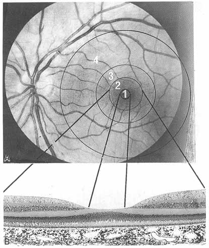 The retina is a very thin, delicate, and transparent membrane, with a surface area of approximately 266 mm2.1–3,97,121,122 It is loosely attached to the choroid via the pigment epithelium. The retina consists of two distinct layers: the neurosensory retina and the retinal pigment epithelium. These two layers extend over the inner surface of the eye from the optic disc posteriorly to the ora serrata anteriorly, where the retinal pigment epithelium becomes continuous with the pigmented epithelium of the ciliary body and the neurosensory retina becomes continuous with the nonpigmented epithelium of the ciliary body. The retinal layers are thickest at the optic disc, measuring 0.56 mm in thickness.123 Peripherally, the retina thins so that at the equator it is 0.18 mm in thickness and at the ora serrata it is 0.1 mm in thickness. The major topographical landmarks of the retina include the optic nerve head, the area centralis, the peripheral retina, the retinal vasculature, and the ora serrata (Fig. 19). The optic nerve head is just nasal to the posterior pole of the eye. Its edge is located approximately 3.42 ± 0.34 mm from the foveola. The optic disc has an average vertical diameter of 1.86 ± 0.21 mm and an average horizontal diameter of 1.75 ± 0.19 mm. Here, all the layers of the retina terminate, with the exception of the nerve fiber layer. The inner layer of the retina terminates before the outer layers, both of which are separated from the optic disc by a thin layer of glial cells called the intermediary tissue of Kuhnt (Fig. 20). The area centralis (macula) is subdivided into the fovea with the central foveola and the surrounding parafovea and perifovea. It is located in the posterior fundus, temporal to the optic disc, and bounded by the superotemporal and inferotemporal retinal vascular arcades. It is elliptical in shape, with its long axis oriented horizontally, and has an average diameter of 5.5 mm, which corresponds to approximately 15 degrees of the central visual field. The macula lutea represents a yellow zone around the fovea. It is horizontally oval, with a diameter of approximately 3 to 5 mm, depending on the method of observation. The yellow color of this zone may be caused by the presence of xanthophyll pigment in the bipolar and ganglion cells in this area. The foveola represents a focal concave depression, where the retina is thinner, and marks the center of the area centralis. It is located approximately 4 mm temporal and 0.8 mm inferior to the center of the optic disc. The average thickness of the foveola as measured by ocular coherence tomography and scanning retinal thickness analyzer ranges from 108 to 178 μm.124,125 It is 0.35 mm in diameter and 0.25 mm in depth. This area subtends 1 degree of the centermost visual field and represents the area of the sharpest visual acuity. This is because of the high density of cone cells, absence of rod cells, avascularity, and peripheral displacement of the inner layers of the retina. This displacement of the inner retina creates the downward slope called the clivus, which meets the floor of the foveola. The optical reflectance is formed by the inner limiting membrane by the concavity of the foveola and the radius of curvature is formed by the clivus decreases significantly with age.126 The inner nuclear layer, inner plexiform layer, ganglion cell layer, and nerve fiber layer are absent in the foveola. The fovea surrounds the foveola and has a diameter of 1.85 mm, which corresponds to the central 5 degrees of the visual field. The average thickness of the retina in this area is 0.25 mm. The foveal avascular zone measures approximately 0.4 mm in diameter. The entire vascular supply to the fovea is via the choriocapillaris. The parafoveal central retina is an annular zone 0.5 mm in width, and along with the fovea, measures 2.5 mm in diameter. It contains the largest number of nerve cells in the entire retina. The thickness of the photoreceptor layer in this portion of the retina is 40 to 45 μm. There are 100 cones per 100 μm2 in this area. The perifoveal central retina or near peripheral retina measures 1.5 mm in width beyond the parafoveal retina. The outer boundary of this area is 2.75 mm from the foveal center. There are nine to 12 cones per each 100 μm2 in the perifoveal central retina. These cones are surrounded by rods. Henle's fiber is absent in this area. The midperiphery consists of an annular area 3-mm wide surrounding the near peripheral retina. The cones in this area number approximately eight to 10 per 100 μm2. These cones are separated from each other by at least three rods. The far peripheral retina extends in width 9 to 10 mm beyond the midperipheral retina temporally and 16 mm nasally. Ganglion cells in this area are quite large and widely spaced. In this area, there are only six to seven cones per 100 μm2, and they have shortened outer segments. Beyond the far peripheral retina is an anterior fringe of the retina that constitutes the ora serrata. It consists of dentate processes with intervening scalloped-shaped bays and marks the zone where the retinal pigment epithelium and the attenuated neurosensory retina tran-sition into the pigmented ciliary epithelium and the nonpigmented ciliary epithelium of the pars plana, respectively. In this area, cones are poorly developed and replace rods. The rod and cone layers ultimately fuse and the plexiform layer disappears as the area of the ora serrata is approached. Approximately 0.5 mm before reaching the ora serrata, ganglion cells, rods, and the nerve fiber layer cease to be present. The ora serrata is 2-mm wide on its temporal side and 0.7- to 0.8-mm wide on its nasal side, and located approximately 6 to 7 mm posterior to the corneoscleral junction. Cystoid degeneration is often present in the peripheral retina near its termination at the ora serrata in the outer plexiform layer, is more prominent nasally, and becomes more pronounced with age.127 The outer