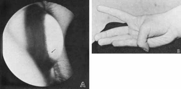 Fig. 4 Keratoglobus. A. Lateral view demonstrates anterior protrusion of thin cornea. Iris process in the angle are visible (arrow) without gonioscopic lens. B. Increased flexion of thumb emphasizes association with lax joints. Keratoglobus is sometimes classified as Ehlers-Danlos syndrome type VIA.