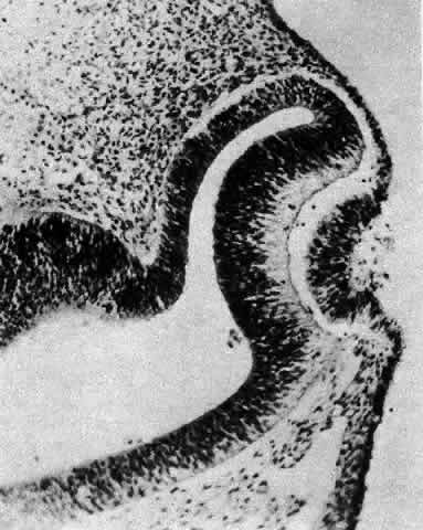 Fig. 3. At the 5-mm stage, the lens placode is clearly beginning to invaginate asymmetrically, and epitrichial cells appear in the deepening lens cup. Carnegie embryo 7394. (Smelser GK: Embryology and morphology of the lens. Invest Ophthalmol 4:398, 1965)