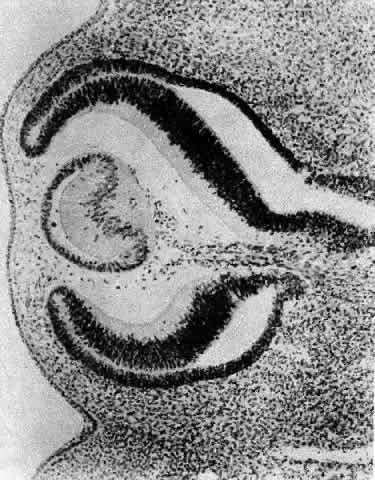 Fig. 9. At about the 25-mm stage (7–8 weeks' gestation) a tremendous burst of proliferative activity begins in the human lens, signaled by the terminal division of equatorial epithelial cells into mature lens fiber cells and a concomitant increase in lens weight. This process continues throughout life, albeit at a much slower rate following maturity. (Courtesy of Dr. Patricia Burke, Columbia University)