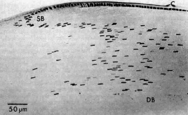 Fig. 17. A sagittal section through the equatorial area of a rat lens showing the characteristic bow pattern produced by the nuclei of newly elongating cells. Note the loss of stainability and eventual disappearance of the nuclei of the deep bow area (DB). This section, which is stained with toluidine blue, also illustrates the basophilia of the cytoplasm of the most superficial fibers (SB) caused by a preponderance of ribosomes. In this case, the capsule (C) stains metachromatically (pinkish purple).