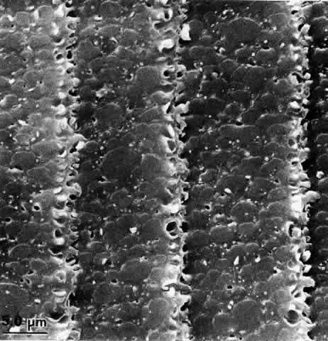 Fig. 19. Scanning electron micrograph of the area of the bow in the rat lens following critical point drying and mechanical fracturing. Low-power scanning electron micrograph (inset) shows the elongated nuclei of internalizing cells. When viewed as increased magnification, fluffy deposits are seen on the surface. Because fracturing occurs between the double-layered membranes of the nuclei, the fluffy material comprises the remains of the outer membrane around nucleopores (× 20,000; inset × 5000).