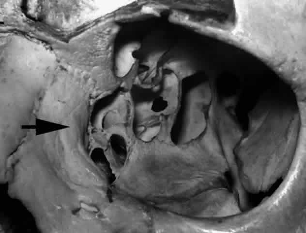 Fig. 26. The fossa for the lacrimal sac is formed by the frontal process of the maxillary bone anteriorly (black arrow) and lacrimal bone, posteriorly (white arrow) (right orbit). The vertically placed “maxillary-lacrimal” suture is seen in the middle of the fossa.