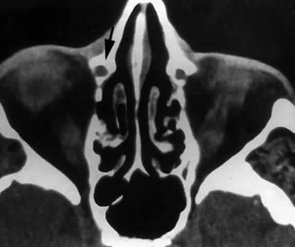 Fig. 27. Ethmoidal air cells extend to the anterior lacrimal crest (arrow), demonstrating a dominant ethmoidal and lacrimal bone contribution to the lacrimal fossa (left orbit).
