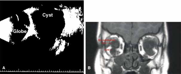 Anophthalmia refers to the complete absence of ocular tissue, presumably caused by abnormalities of optic vesicle formation or maturation. Patients may have unilateral or bilateral anophthalmia, and generally have short palpebral fissures and small orbits. In many cases when there is no clinically apparent ophthalmic tissue, remnants of lens epithelium, neuroretinal, and fibrovascular, choroid-like tissue can be detected on histologic sectioning. Terms such as “true anophthalmia,” “extreme microphthalmia,”10 and “clinical anophthalmia”11 have been used in the literature to describe what may be, in truth, a phenotypic continuum between anophthalmia and microphthalmia (see later).