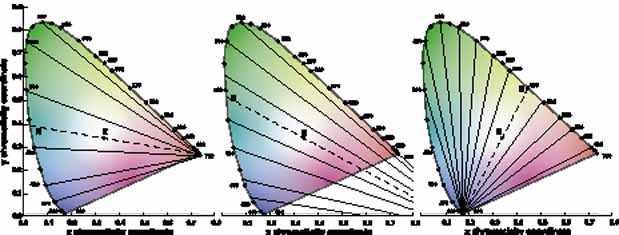 TRICHROMACY OF NORMAL VISION The fact that the normal human eye can match any color by the mixture of three other colors (none of which can be mixed to match the third “primary” color) is what leads to the conclusion that normal vision is trichromatic. James Clerk Maxwell in 1855 provided the first quantitative data on trichromacy. He used a spinning top to additively mix colors and determined the relative amounts of various primaries needed to match a reference white.5 It should be clear that trichromacy is an empirical finding and it implies that there are three fundamental variables or channels, the relative outputs of which determine our color matching behavior. It does not state that there are three cone pigments, although this is certainly an appealing and simple connection to make. Conceptually one will not go far wrong in making this connection. A more recent approach is to use a fixed set of primaries and to determine the relative amounts of each needed to perfectly match all visible wavelengths in turn. In 1931 a set of color mixing data was adopted by the CIE (Commission Internationale d'Eclairaige) as the Standard Colorimetric Observer with red, green, and blue color primaries (RGB) This was the first step in deriving an internationally recognized color system based on human visual performance. The CIE 1931 RGB system could be used to specify colors as seen by the human eye. The amounts of these three RGB primaries allowed specification of the color matches of the monochromatic wavelengths across the spectrum assigning them “tristimulus values.” In specifying any colors the relative amounts of these primaries (r, g) required to match a color can be used to generate a two-dimensional chromaticity plot. In the RGB system of colorimetry, some colors have a negative chromaticity coordinate. This tends to occur when attempting to make a match to many blue–green lights. However, conversion of one set of primaries to another is simply matrix algebra and there are solutions in which the color matching functions are all positive. In these cases, the primaries lie outside the spectral locus, which means that they are unrealizable or imaginary primaries. This has been performed by the international community with the CIE 1931 XYZ system. It has no negative numbers. The XYZ system has one further feature. The spectral shape of the tristimulus values of the Y primary, for the equal energy monochromatic spectrum, was chosen to match the CIE 1924 luminosity curve. Consequently, two samples with same Y tristimulus values are defined as having equal luminance, regardless of their Z and X values. This means that luminance can be derived by calculating the total amount of Y primary in the XYZ mixture required to match the color that is being specified. Again, the amounts of each of these three XYZ primaries needed for color matches of the individual monochromatic wavelengths across the spectrum allows specification of their “tristimulus values” (Fig. 17).