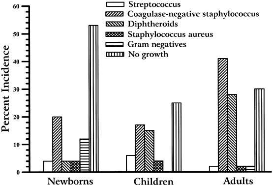 Fig. 1. Distribution of ocular bacterial isolates from the normal conjunctivas of newborns (Brook I, Barrett CT, Brinkman CR et al: Aerobic and anaerobic bacterial flora of the maternal cervix and newborn gastric fluid and conjunctiva: A prospective study. Pediatrics 63:451, 1979; Lee PW, Jun AK, Cho BC. A study of microbial flora of conjunctival sac in newborns. Korean J Ophthalmol 3:38, 1989), children (Weiss A, Brinser JH, Nazar-Stewart: Acute conjunctivitis in childhood. J Pediatr 122:10, 1993; Singer TR, Isenberg SJ, Apt L: Conjunctival anaerobic and aerobic bacterial flora in paediatric versus adult subjects. Br J Ophthalmol 72:448, 1988) and adults (McNatt J, Allen SD, Wilson LA et al: Anaerobic flora of the normal human conjunctival sac. Arch Ophthalmol 96:1448, 1978; Singer TR, Isenberg SJ, Apt L: Conjunctival anaerobic and aerobic bacterial flora in paediatric versus adult subjects. Br J Ophthalmol 72:448, 1988; Boes DA, Lindquist TD, Fritsche TR et al: Effects of povidone-iodine chemical preparation and saline irrigation on the perilimbal flora. Ophthalmology 99:1569, 1992.)