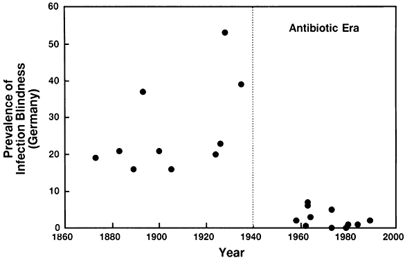 Cross-sectional surveys in the United States show that socioeconomic status is one of the most important determinants of ocular health.7,8 The relationship between income and infectious eye disease has been presumed but not proven. However, international comparisons suggest that economic development accounts for a substantial portion of infectious blindness. In developed nations, infections are the cause of approximately 1% of partially sighted people; in less developed regions, the burden of visual loss resulting from infectious diseases is much greater. Populations at particular risk of infectious visual disability are the poor, who live and work in unhygienic conditions. EMERGENCE OF OPHTHALMIC EPIDEMIOLOGY The discipline of epidemiology began with the study of epidemics, the increased frequency of a disease in a specified population within a given time. Epidemics of eye disease have been recognized since antiquity, often in association with the natural environment or war.9 A recognition of contagion, an understanding of ocular inflammation, and advances in mathematics were prerequisite to the development of ophthalmic epidemiology. Abrupt outbreaks, such as those typical of viral conjunctivitis, are easily noticed, but knowledge of endemic-level disease frequency is needed to recognize epidemics of less common or of slow-onset infections. Census statistics collected by many nations during the 19th century included blindness prevalence and, by the end of that century, of the causes of blinding ocular disease. For example, infectious diseases accounted for 72% and 85% of all causes of blindness in northern Europe in 1883 and 1902, respectively. By 1926, population-based data indicated that the percentage had decreased to 47%,10 partly because the proportion of blindness due to ophthalmia neonatorum dropped from 18% of all blindness in 1902 to 5% in 1926, a reduction largely attributed to Credé prophylaxis. Although the reasons for a decline in the relative importance of other infections are less obvious, they probably relate to improved sanitation after the Industrial Revolution. Infection remained a major contributor to blindness until the 1930s; after the end of World War II, the percentage of blindness due to infectious diseases declined dramatically in many parts of the world11 (Fig. 1). The first major effect of epidemiology on ocular infections occurred during the early bacteriologic era. Recognition that trachoma and other external eye infections were among the world's leading causes of blindness led to enormous public health efforts at their containment and eradication. In the late 19th and early 20th centuries, immigration services routinely screened for trachoma (Fig. 2), and it was a common reason for deportation. Throughout the 20th century, much effort was aimed at stopping trachoma's spread and limiting its complications. Increased prosperity reduced the incidence of trachoma in Europe and the United States, but chlamydial and other infections are still major contributors to blindness in Africa and Asia (Table 3).