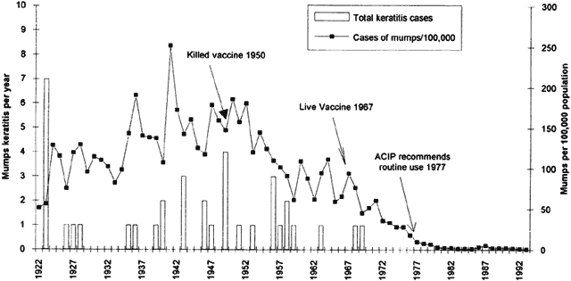 Identification of an epidemic requires recognition of new cases of a disease. An outbreak is often depicted as an epidemic curve, the histogram display of cases occurring during a period. However, the epidemiology of many infections is both endemic and epidemic. For example, before widespread immunization, rubella in the United States occurred by interpersonal spread among schoolchildren and older individuals. Superimposed on this endemic-level disease was a cycle of epidemics at 7-year intervals (Fig. 7). Conjunctivitis is very common during rubella, and epithelial keratitis occasionally occurs. The recognition, first made by an ophthalmologist,15 that rubella virus was a potent teratogen, further showed the epidemiologic importance of this common disease. The 1964-1965 epidemic produced a substantial human and economic burden, involving 12.5 million rubella cases; 20,000 infants were born with congenital rubella syndrome, including 3580 who were blind.16 It is mainly because of the success of the rubella vaccine that no more than 50 cases per year of congenital rubella syndrome have occurred in the United States since 1966. Implementation of a national immunization policy suppresses endemic infection and blunts epidemics. In the prevaccine era, mumps occurred in epidemic cycles of 3-to-5 years, and a large pool of cases resulted in occasional cases of dacryoadenitis, mumps keratitis (Fig. 8), and encephalitis. Because of the widespread use of live mumps vaccine after 1967, the occurrence of mumps has become rare, and mumps keratitis has essentially disappeared.