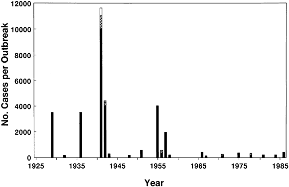 Most common-source outbreaks of endophthalmitis are related to contamination introduced during intraocular surgery62,154–167 (Table 29). Clusters of endogenous infection have also occurred. For example, endophthalmitis and other infections among neutropenic patients was traced to a contaminated skin lotion,168 and another cluster of fungal endophthalmitis followed exposure to a contaminated intravenous anesthetic agent.169 Sharing syringes among drug addicts can also produce outbreaks of fungal endophthalmitis.170 Determining whether an outbreak is171 or is not172 due to a common source is aided by techniques of molecular epidemiology.