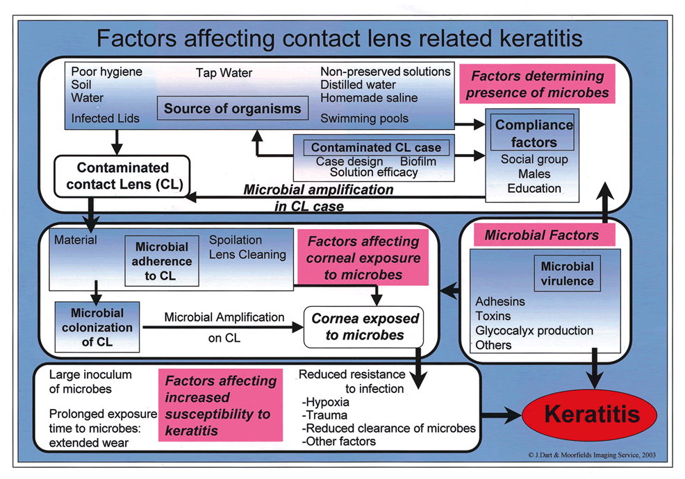 Epidemiology is the study of the distribution and determinants of disease in a population. Epidemiologic studies have made a substantial contribution to our knowledge both of predisposing causes and of some of the factors to be considered in the pathogenesis of MK, particularly in CL wearers. Until the use of CLs became widespread as an alternative to spectacles, MK occurred in eyes with disrupted ocular defence mechanisms. The most important causes were corneal trauma and surgery, post-herpetic corneal disease, bullous keratopathy, corneal anaesthesia, corneal exposure, and the dry eye. CL wearers made up only a small proportion of patients with this disease.37–39 In the 1980s the number of CL users grew and the proportion of MK cases attributed to CL wear rose to over 50% in some centers, 3,5,40,41 making CL wear one of the major predisposing factors for MK in some populations. This problem has been of concern because, unlike other causes, it can be avoided and is potentially preventable.