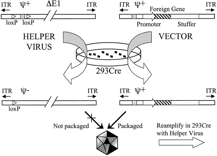 Fig. 3. Propagation of gutted adenoviral vector constructs. This diagram is a schema for the propagation of gutted vectors. The helper phage is E1 deleted and must be propagated in a cell line (293) that expresses E1. The helper phage contains a packaging signal (Ψ) that is flanked by loxP recombination target sites. The gutted vector construct contains the flanking inverted terminal repeats, the foreign DNA that is driven by a viral promoter, and a stuffer fragment. The 293Cre cell line expresses the bacteriophage P1 Cre recombinase. When the 293Cre cell line is concomitantly infected with the helper phage and the gutted vector construct, the helper phage packages the gutted vector construct. Meanwhile, the helper phage undergoes loss of the packaging signal (Ψ) through recombination of the loxP sites with Cre recombinase and cannot be packaged. This process allows amplification and packaging of the gutted vector construct by serial passage, while minimizing helper phage contamination of the prepared virus stock. (Adapted from Parks RJ, Chen L, Anton M et al: A helper-dependent adenovirus vector system: Removal of helper virus by Cre-mediated excision of the viral packaging signal. Proc Natl Acad Sci U S A 93:13565, 1996)