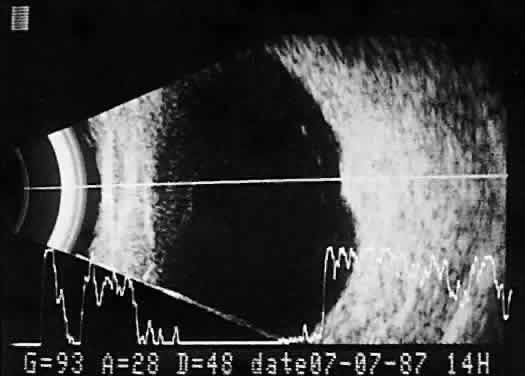 Fig. 7. Contact B-scan. Clotted or clumped cells, such as those seen in mild vitreous hemorrhage, appear pale gray.