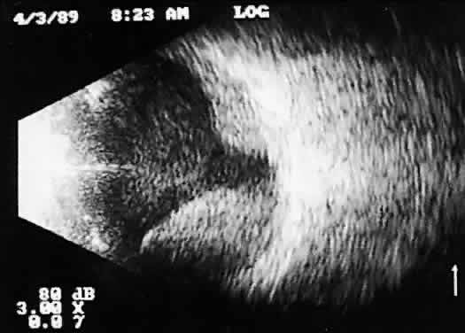 Real time refers to the display of motion or movement during B-scan imaging. This capability is one of the greatest advantages of B-scan. Differences in mobility of a variety of movable intraocular abnormalities can be easily detected. For example, the rapid movement of vitreous hemorrhage is usually easy to appreciate and differentiate from the slower, undulating movements of a recent, rhegmatogenous retinal detachment. On occasion, movement of intraocular structures can be used for detecting abnormalities that lie immediately behind vitreous opacification and may be seen only when the vitreous opacities are moved away from the ocular wall, set in motion by command voluntary movements of the patient's globe (Fig. 5). Gray scale refers to the variable gray tone of display screen echoes. Strong returning signals (echoes) appear white, whereas weaker reflections are seen as gray, the shade depending on echo strength. Examples of strong reflectors of sound include retinal tissue, sclera, and calcifications of any type (Fig. 6). Weaker echoes from clotted or clumped cells within the vitreous are usually easy to differentiate from the stronger reflectors of sound (Fig. 7). Grading of echo strength may be performed only when the examining ultrasound beam is perpendicular to the object of interest, ensuring the strongest possible reflections. However, in the world of ultrasound interpretation, there are many exception to the rules. Tissues that are usually mild reflectors of sound, such as hemorrhage, can at times appear quite strong, especially in complex or multiple pattern disorders, as frequently occur in severe ocular trauma. These apparent inconsistencies often cause misinterpretation by the novice. With experience obtained by multiple examinations, careful follow-up, and clinical correlation whenever possible, diagnostic acumen rapidly improves.