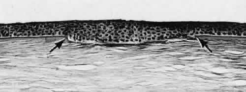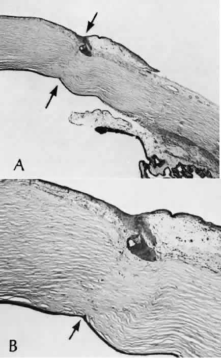 Fig. 3. Epithelial facet. The superficial defect between the cut edges of Bowman's membrane (arrows) is filled with epithelial cells in such a manner as to reestablish the original surface contour of the cornea. Bowman's membrane will not regenerate in this area. Because of the limited extent of the injury, the underlying collagenous tissue does not participate in the wound healing process. (Wilder reticulum stain; × 145.)