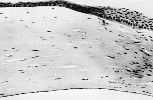 Fig. 5. Collagen lamellae retract when cut, causing the wound to gape when incised. If the extent of the incision is limited, as in clear cornea cataract incisions, the gaping may be countered by swelling of corneal stroma exposed to aqueous media. (Hematoxylin-eosin stain; × 100.)