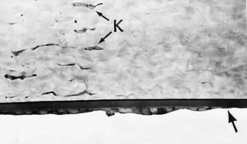 Fig. 7. Attenuated advancing edge (arrow) of corneal endothelium sliding over Descemet's membrane to close an area of endothelial loss caused by an ultraviolet laser. Keratocytes in the region (K) appear to be activated as well. (PD stain; × 300.)
