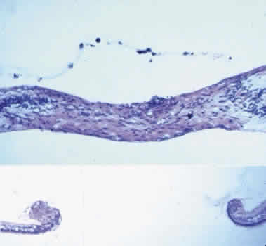 The capsulotomy incision is anterior to the insertion of the zonules through a relatively thick area of the anterior capsule. Most of the lens epithelial cells are removed with the anterior capsule, although some cells may remain in the region of the equator of the lens (Fig. 15). The residual lens capsule is thinnest at its posterior pole. The anterior capsular flap often adheres to the posterior capsule, encasing any residual cortical material and lens epithelial cells. Lens epithelial cells may grow to form large cells, called bladder cells, or may undergo fibrous metaplasia to form a collagenous plaque. Lens cortex outside the lens capsule has an amorphous appearance and is present only in the earliest postoperative specimens.