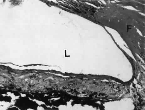 Fig. 17. Light micrograph of fibrous tissue (F) completely filling the anterior chamber in a complicated case of pseudophakia. The outline of the lens optic (L) lies within the proliferated fibrous tissue and anterior to the remnants of the iris pigment epithelium (arrow).