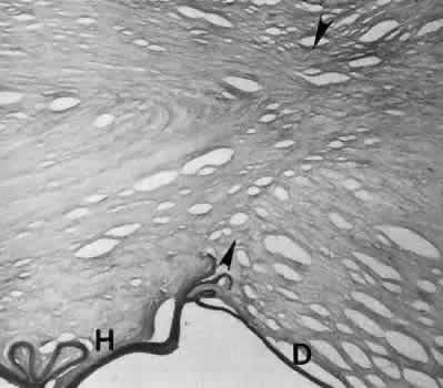 Fig. 18. Light micrograph of a healed penetrating keratoplasty incision. The healed collagenous portion (between arrowheads) is barely visible. The host Descemet's membrane (H) is considerably thicker (older) and abnormal relative to the donor Descemet's membrane (D). A few redundant areas of Descemet's membrane are present at the graft-host interface. (Periodic acid-Schiff stain; × 40.)