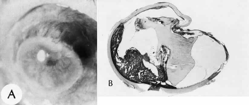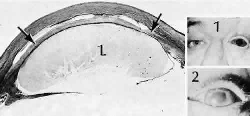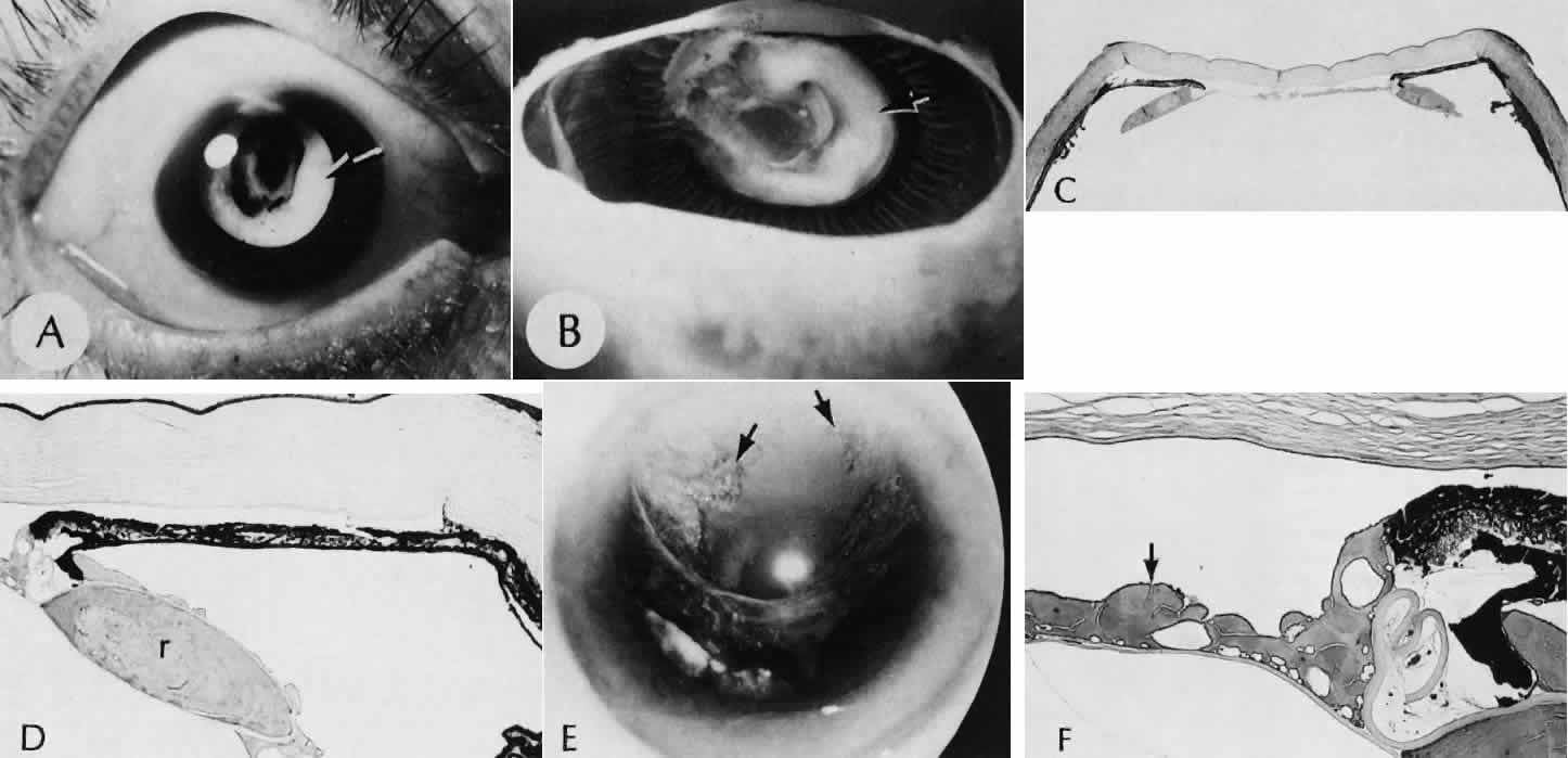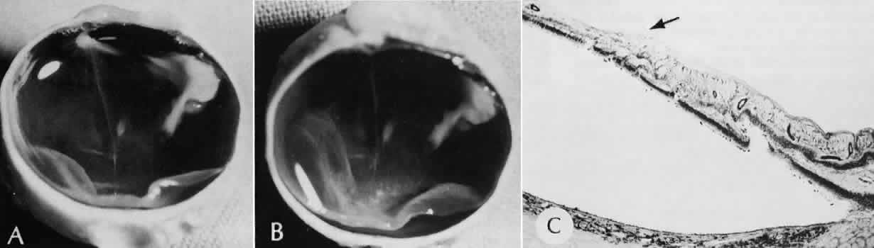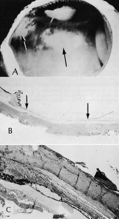 Fig. 20. Cyclodiathermy treatment of the ciliary body to control glaucoma. A. Gross photograph illustrates extensive areas of depigmentation mainly in the region of the pars plana (arrows) rather than the pars plicata. B. Light micrograph of the region of the pars plana illustrates an extensive area of tissue degeneration of the pars plana (between arrows) in the late postoperative course. C. Light micrograph of the destructive effects of cyclocryotherapy also in the region of the pars plana and pars plicata. The ciliary epithelium in the early postoperative period is necrotic and cystic. (Hematoxin-eosin stain; A, × 8; B, × 16.)