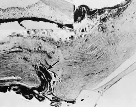 Fig. 15. Light micrograph of lens remnants (arrow) in a case of cataract extraction complicated by posterior synechiae formation to lens capsular remnants. Residual lens epithelial cells have undergone fibrous metaplasia. (Periodic acid-Schiff stain; × 40.)