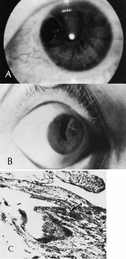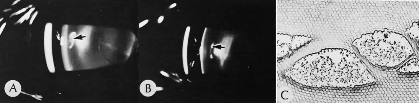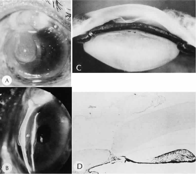 Occasionally, collagenous tissue will completely encircle a lens (Fig. 17). Iris-supported lenses are associated with the loss of central iris pigment epithelium or residual nylon suture in the posterior chamber. Posterior chamber lenses are the most difficult to identify unless surrounded by lens remnants, in which case a negative image of the optic or loops can be seen. Sulcus-fixed lenses will show focal areas of iris pigment epithelial depigmentation or iris stromal erosion. The lens loop may displace the peripheral iris to come in contact with the trabecular meshwork.