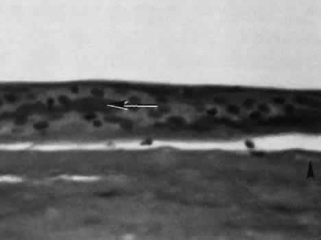 Fig. 11. Light micrograph of a small rent in the capsule of a crystalline lens caused by a needle tip. A small wound such as this may heal leaving only focal opacification. Generalized lens opacification is the more common outcome of crystalline lens capsular damage. (Periodic acid-Schiff stain; × 100.)